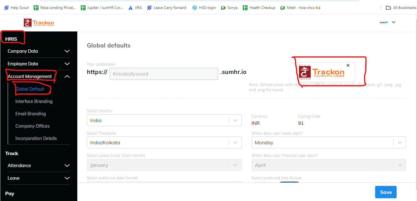 - Under HRIS DATA Click on ACCOUNT MANAGEMENT then GLOBAL DEFAULT > Click on X option and upload your COMPANY'S LOGO.
